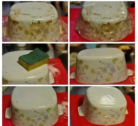 5、**天,將保鮮膜撕下來(lái),直接用百潔布擦洗,這時(shí)候所有的污垢都自動(dòng)脫落了,整個(gè)鍋煥然一新,非常干凈。